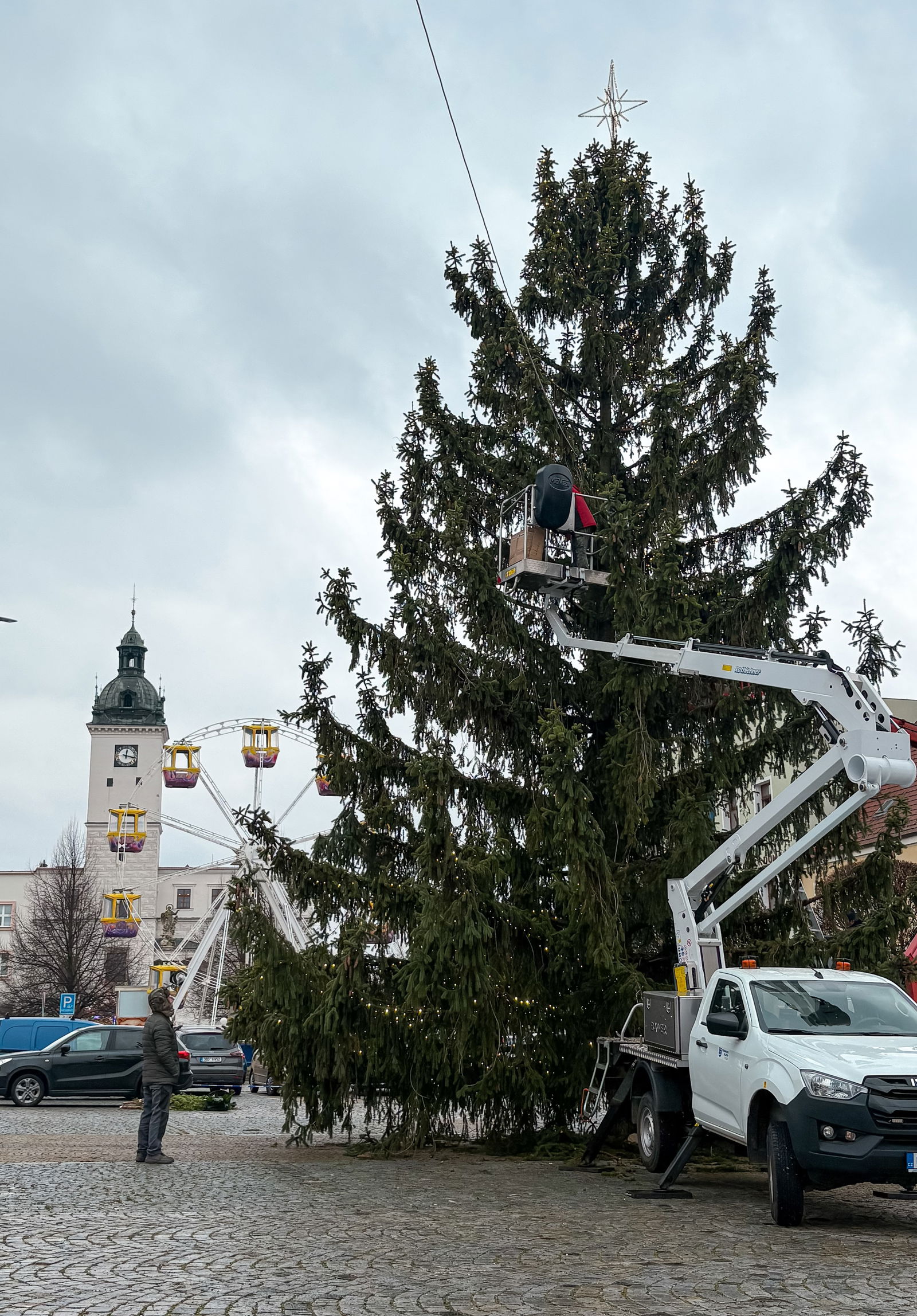 Letošní vánoční strom dorazil na Masarykovo náměstí přesně měsíc před Štědrým dnem. Původně vybraný strom z Vřesovic musel být z technických důvodů nahrazen tímto náhradním.